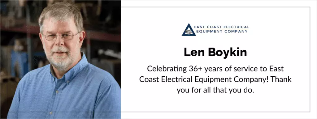 This year marks the 36th anniversary of our longest active employee, Len Boykin! After graduating from NC State University in 1984, Len joined our company in 1985 and has been an integral member of the East Coast Electrical Equipment team ever since. Len serves as our most senior sales engineer and is a tremendous asset to our company. Our customers benefit from Len’s knowledge regularly, as he handles increasingly complex new and used motor applications and sales. We are certainly grateful for Len as he continues to improve our business every single day.