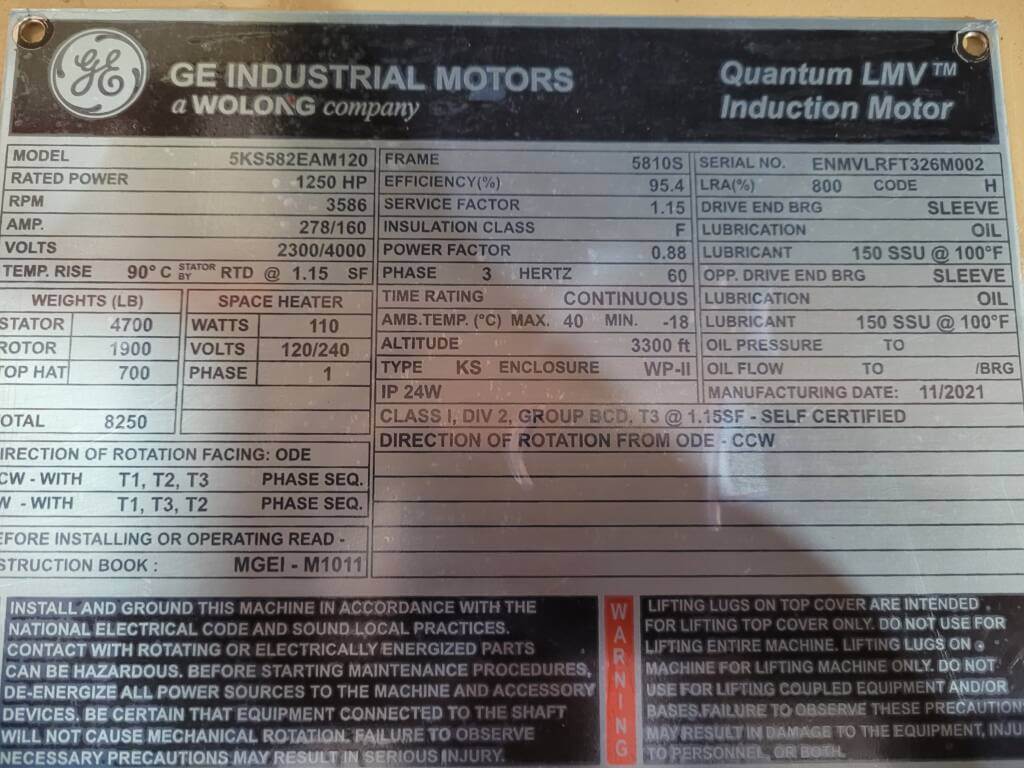 1250 HP, 3600 RPM, G.E., FRAME 5810S, SBWPII, 2300/4000V, NEW