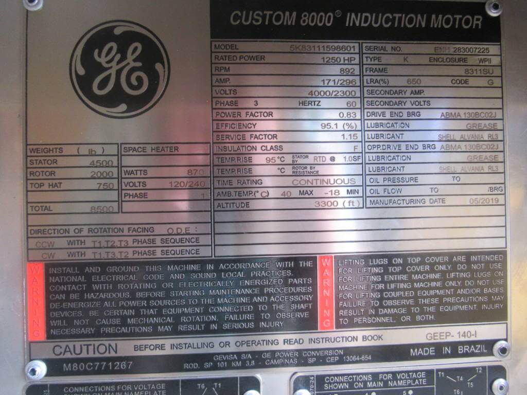 1250 HP, 900 RPM, GE, FRAME 8311SU, BBWPII, 2300/4000V, NEW, (2)