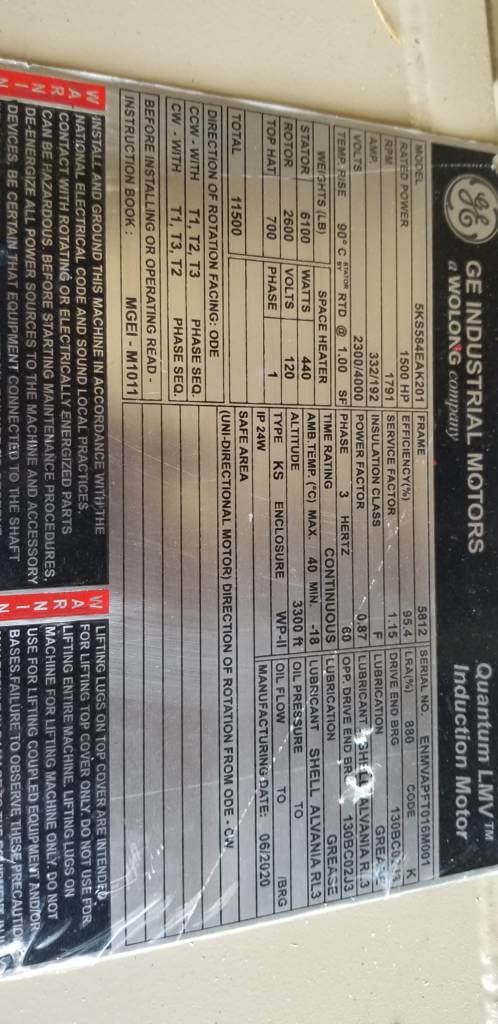 1500 HP, 1800 RPM, GE, FRAME 5812, BBWPII, 2300/4000V, NEW