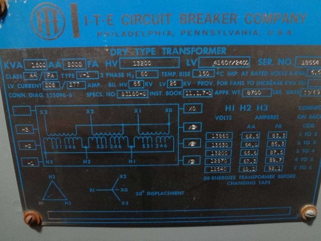 1500/2000 KVA, 13,200 Delta Pri., 4160Y/2400 Sec., ITE, dry type