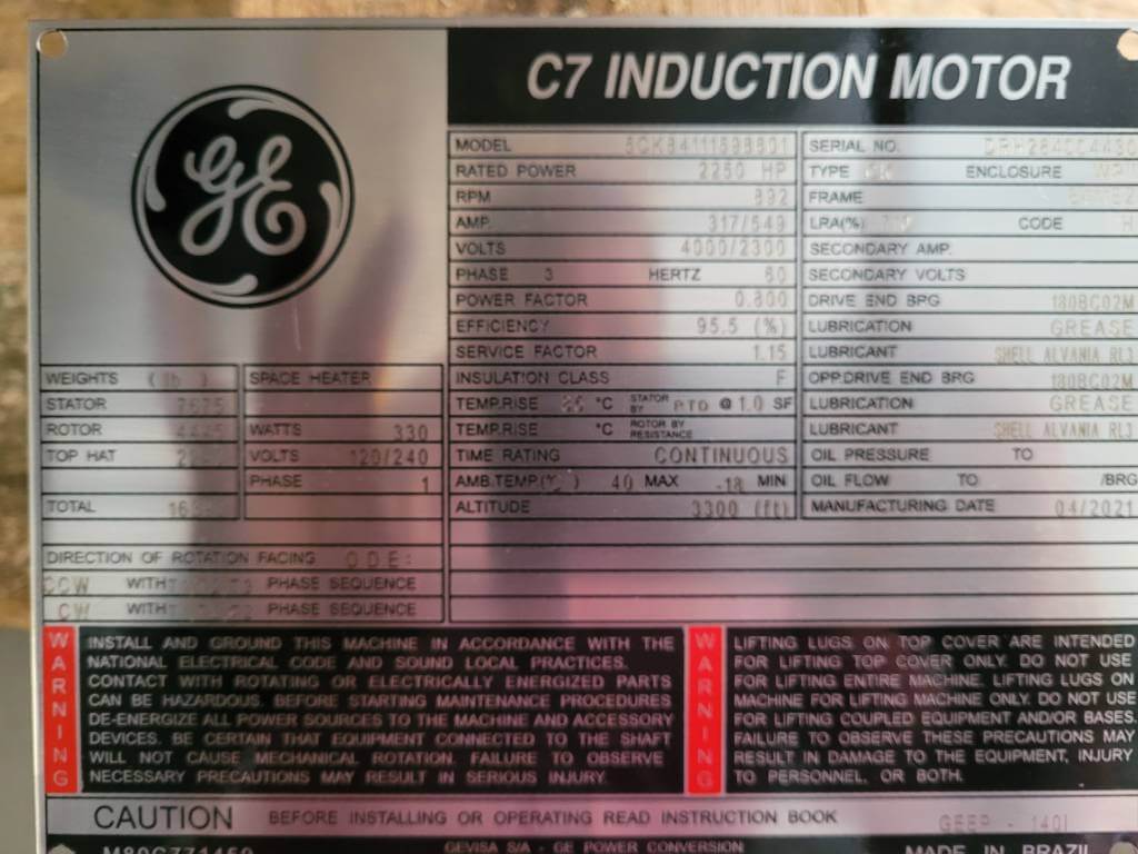 2250 HP, 900 RPM, G.E., FRAME 8411EZ, BBWPII, 2300/4000V, NEW