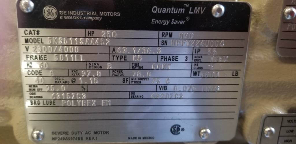 250 HP, 900 RPM, GE, FRAME 5011LL, BBTEFC, 2300/4000 V, NEW