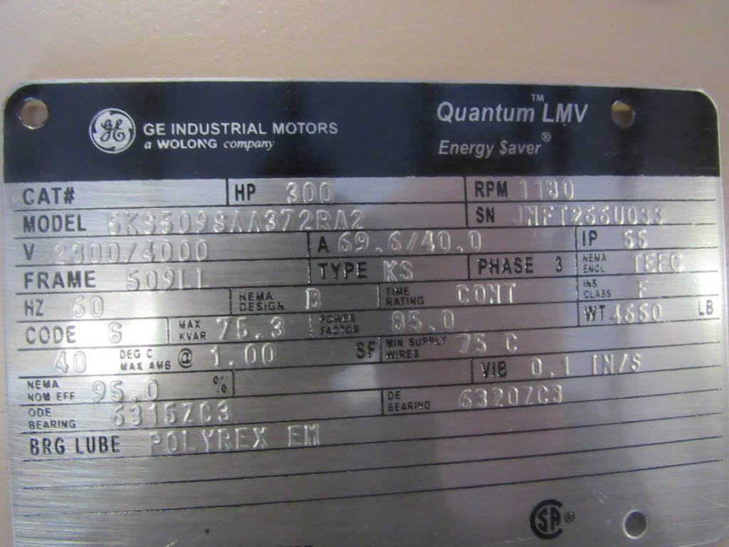 300 HP, 1200 RPM, GE, FRAME 509LL, BBTEFC, 2300/4000V, NEW, (2)