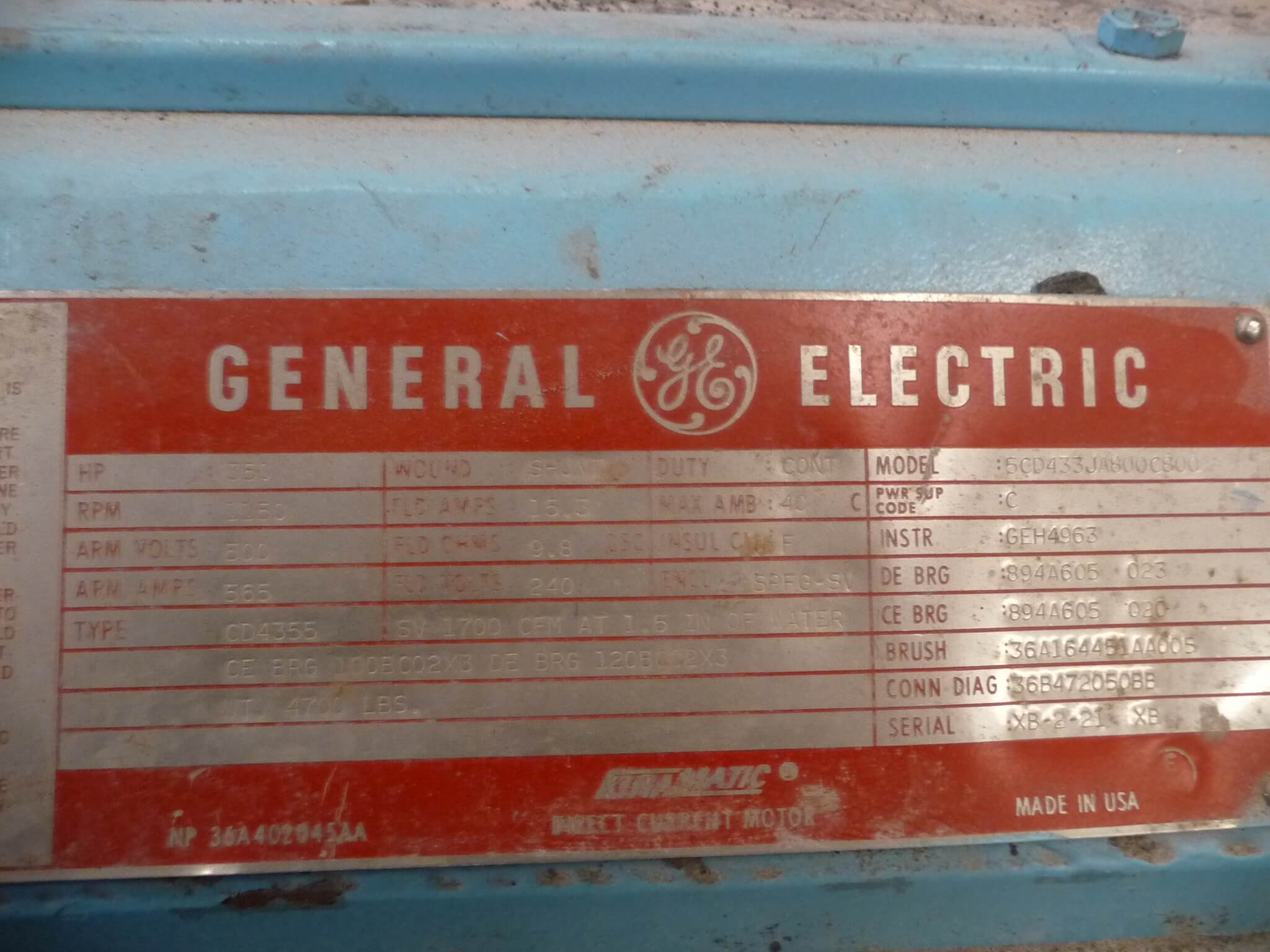 350 HP, 1150 RPM, GE, FRAME CD4355, BB, SPFG-SV, 500V