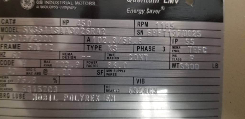 450 HP, 1200 RPM, GE, FRAME 5011, BBTEFC, 2300/4000V, NEW