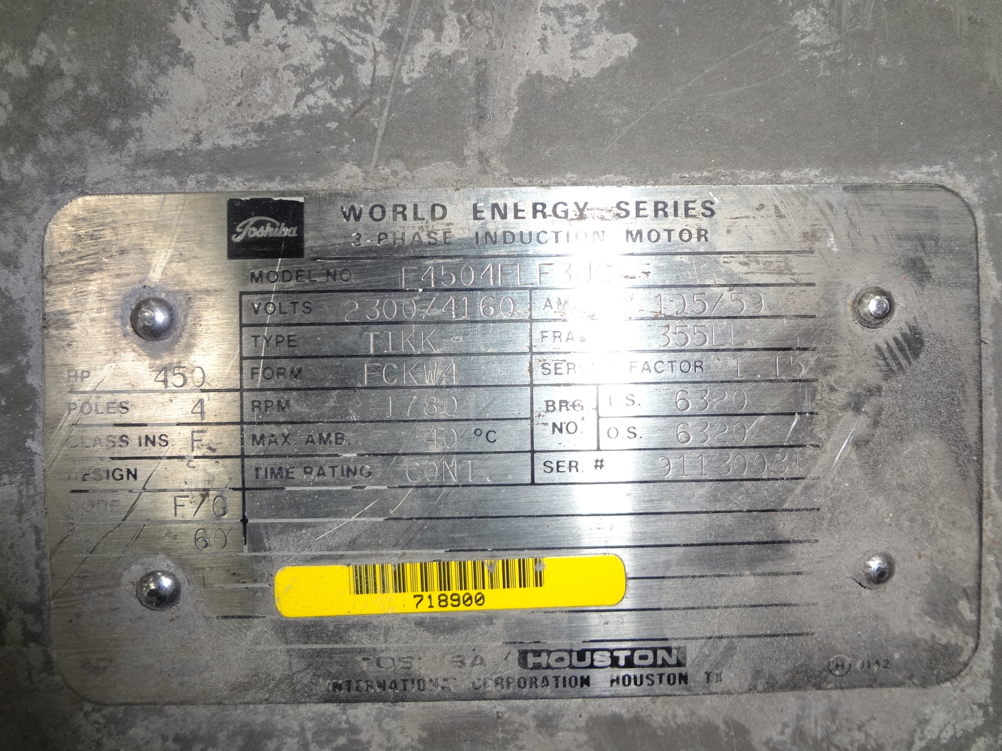 450 HP, 1800 RPM, TOSH, FRAME 355LL, BBTEFC, 2300/4160V