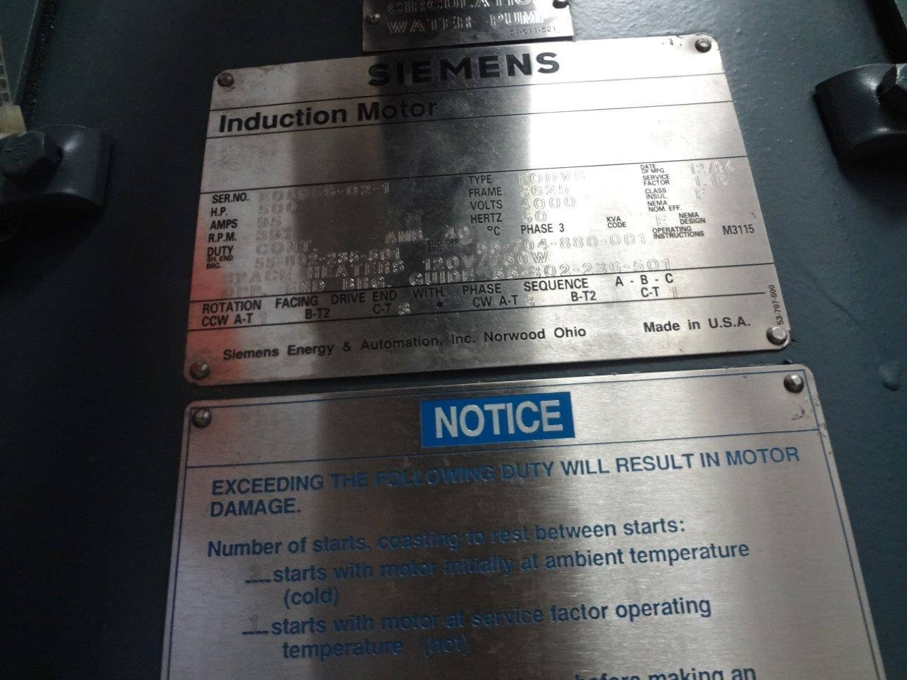 500 HP, 400 RPM, SIEMENS, FRAME 3625, BBWPII, 4000V