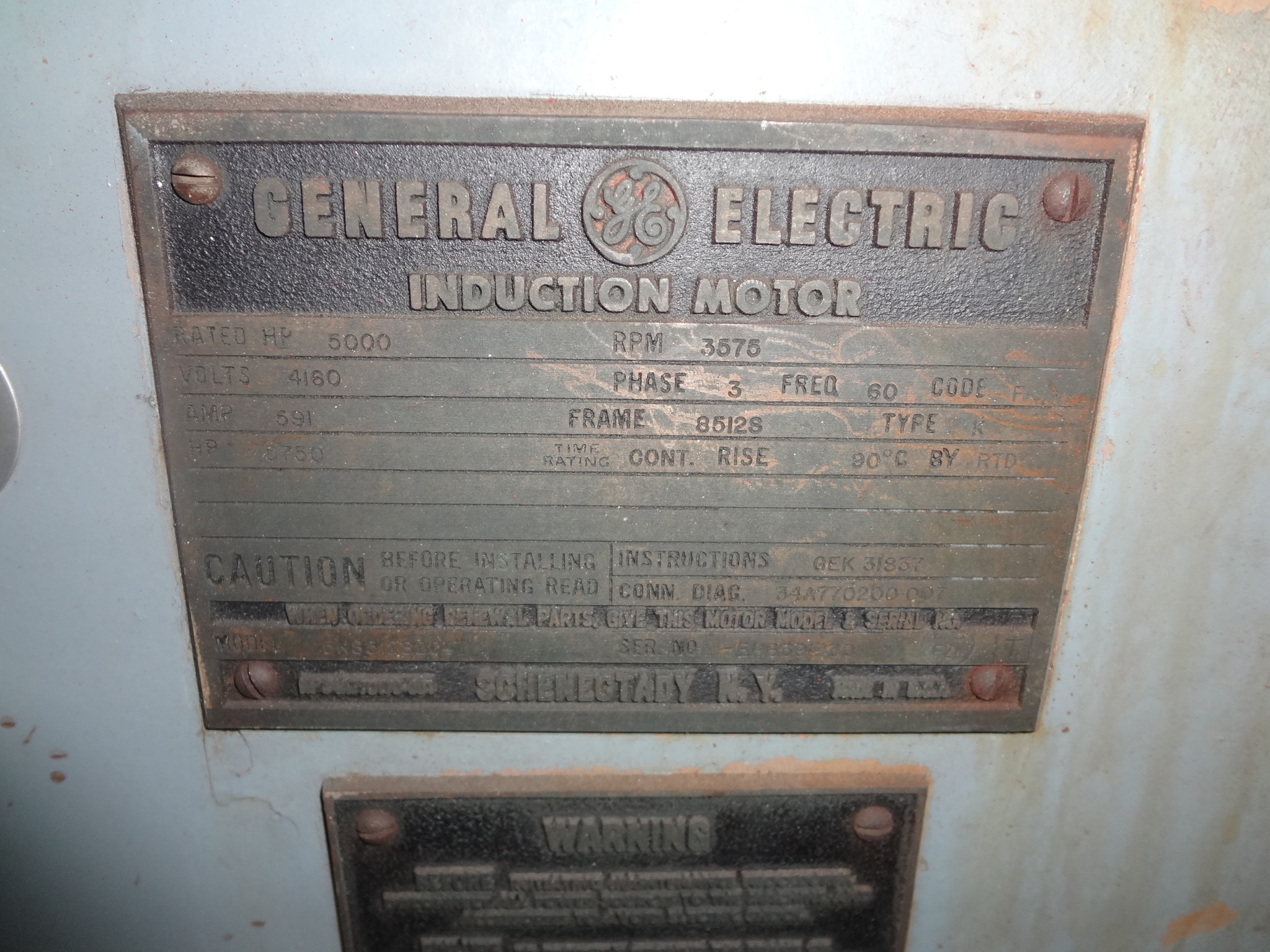 5000 HP, 3600 RPM, GE, FRAME 8512S, SBWPII, 4160V