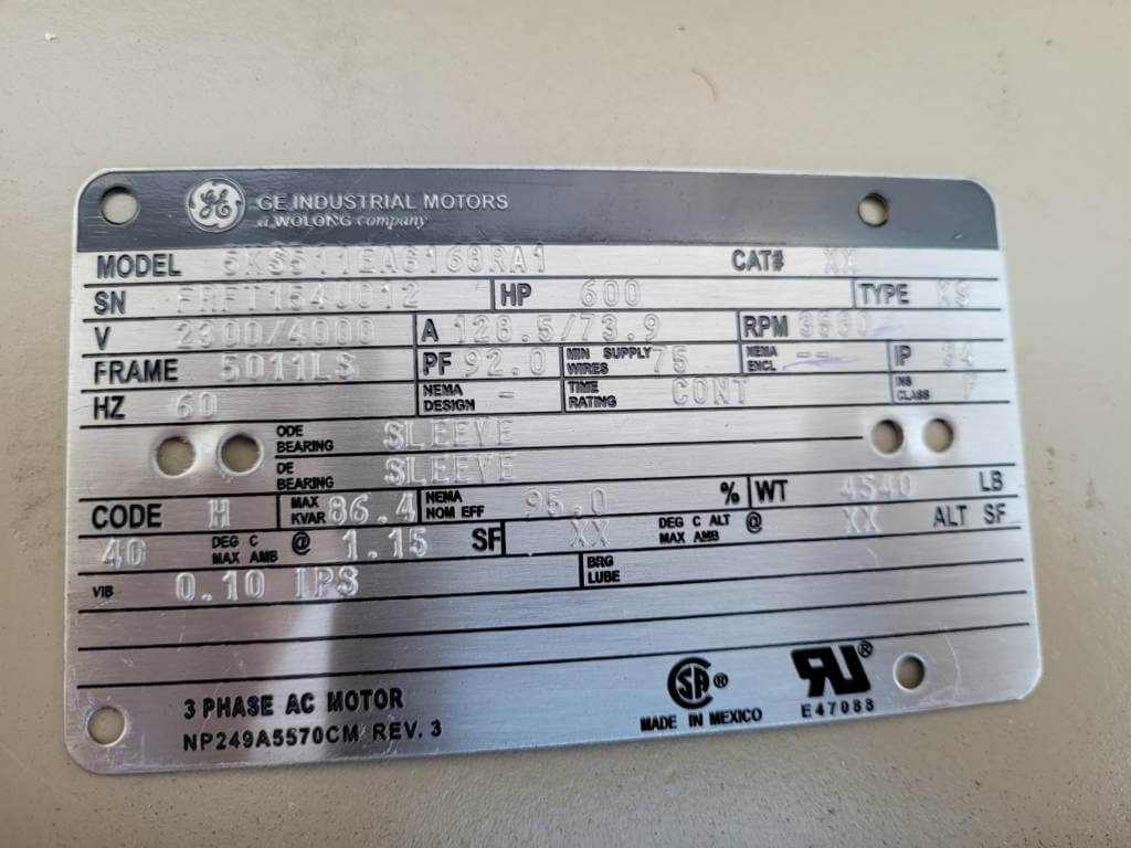 600 HP, 3600 RPM, G.E., FRAME 5011LS, SBWPII, 2300/4000V, NEW