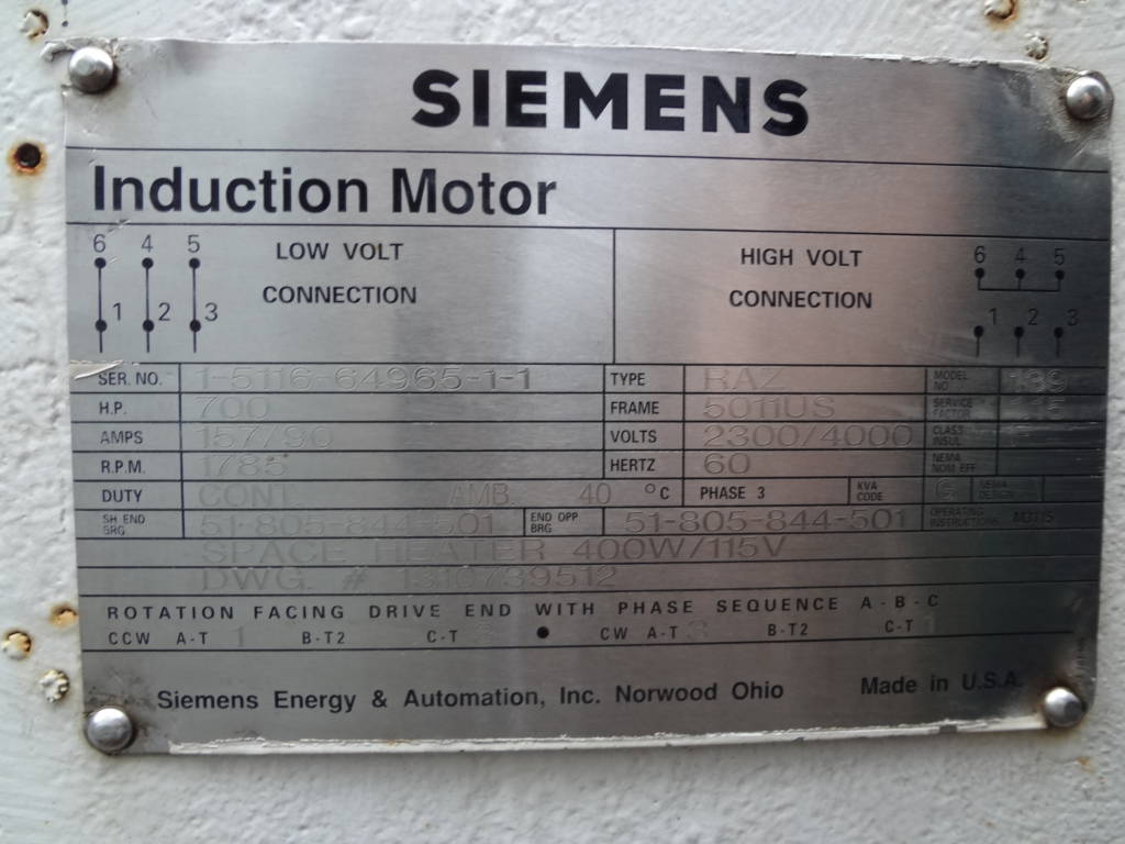 700 HP, 1800 RPM, SIE, FRAME 5011US, SBTEAAC, 2300/4000V